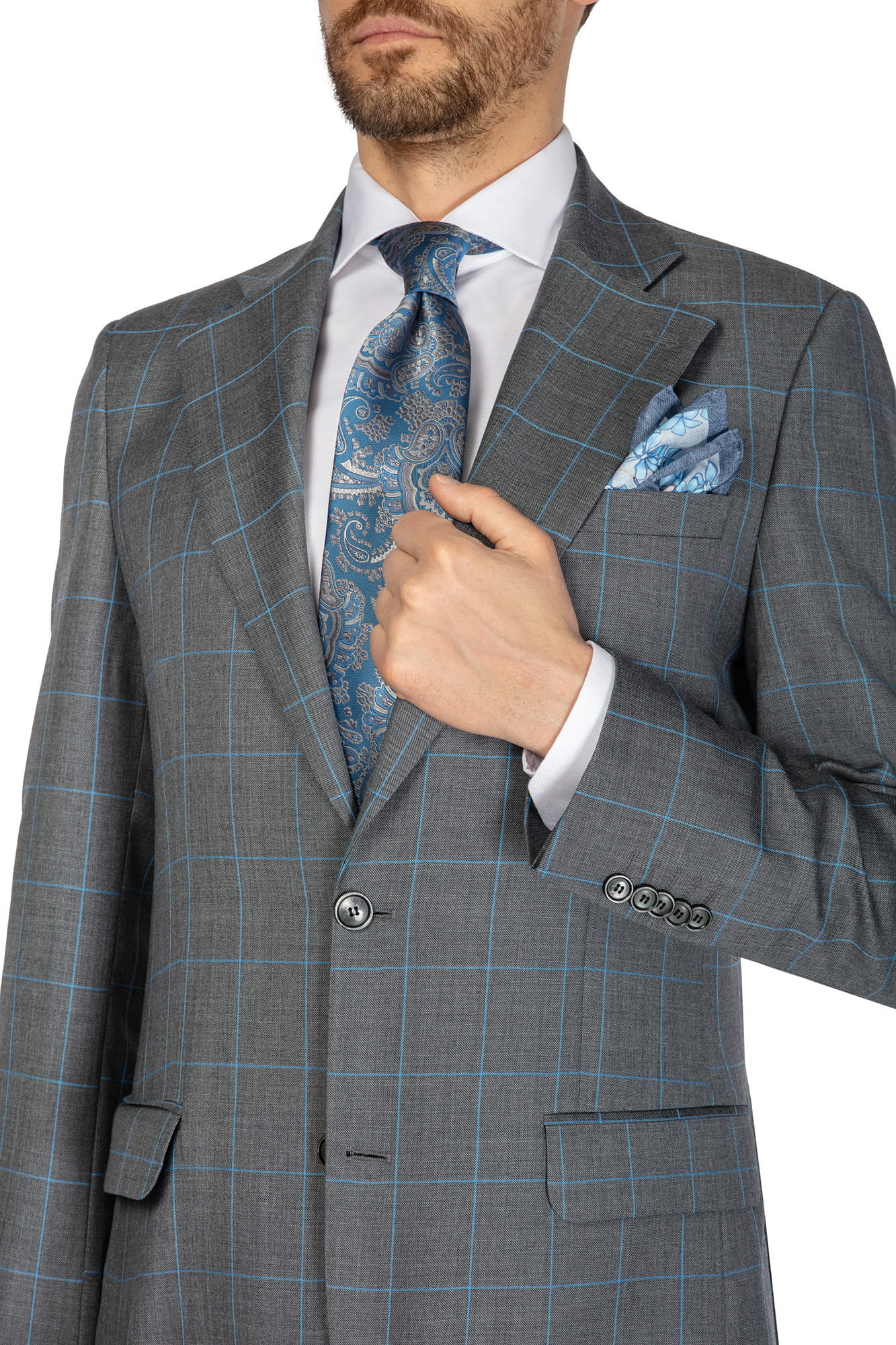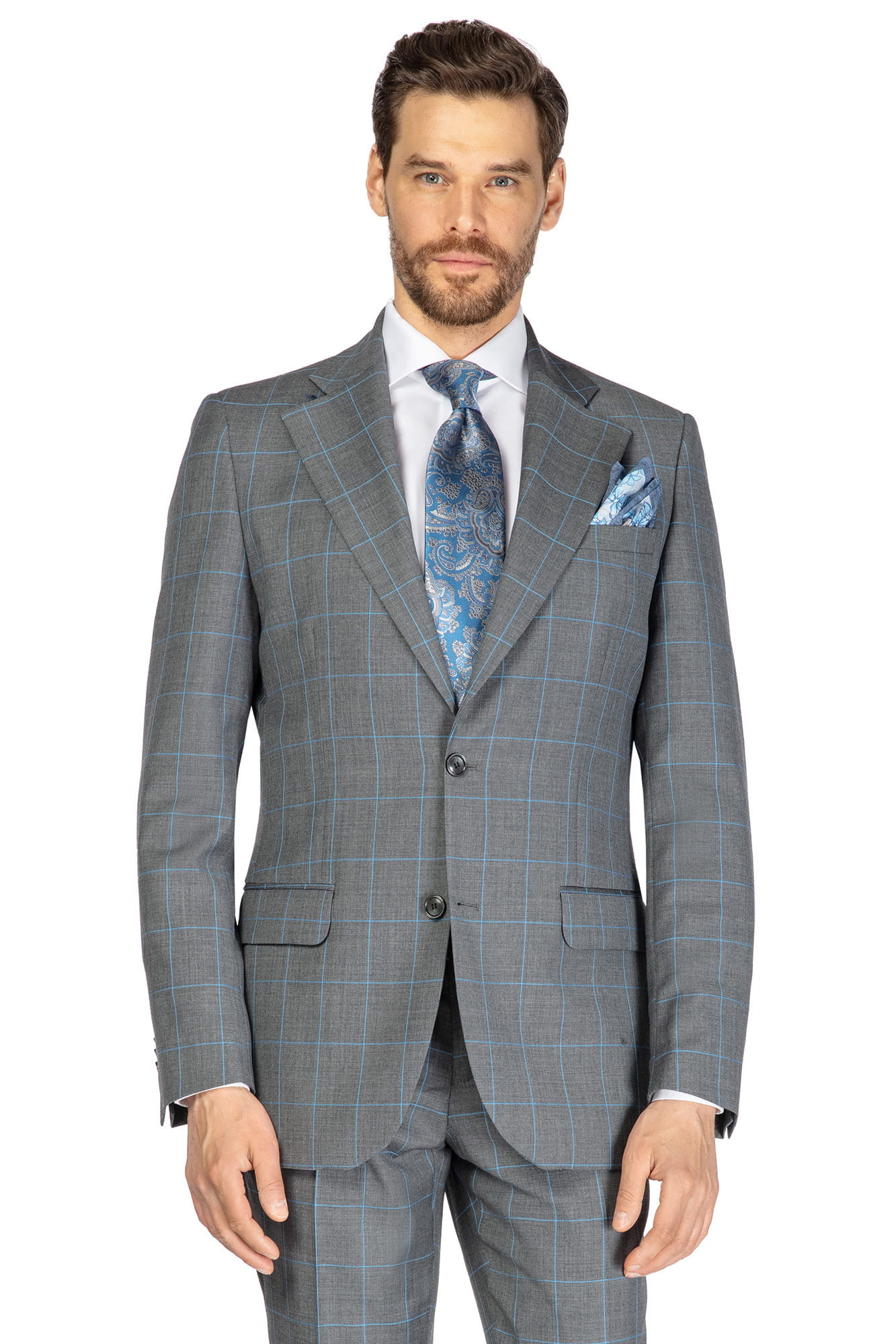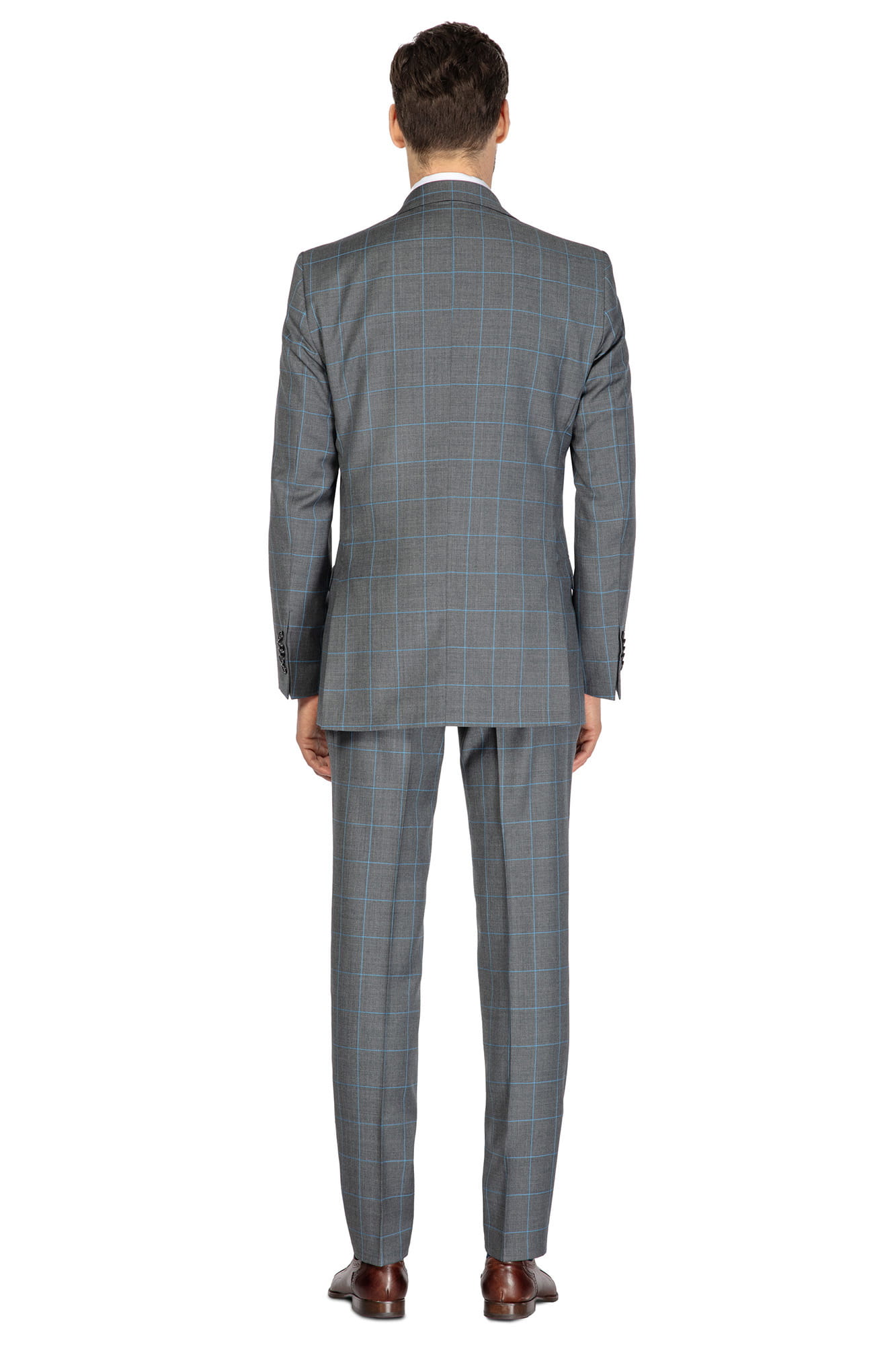 Garnitur MARCEL, wełna 100%, szary w turkusową kratę